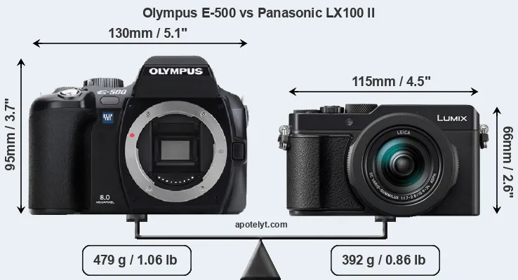 The above size and weight comparisons are to some extent incomplete and possibly misleading, as the LX100 II has a lens built in, whereas the E-500 is an interchangeable lens camera that requires a separate lens. Attaching the latter will add extra weight and bulk to the setup. You can compare the optics available for the E-500 and their specifications in the Four Thirds Lens Catalog.