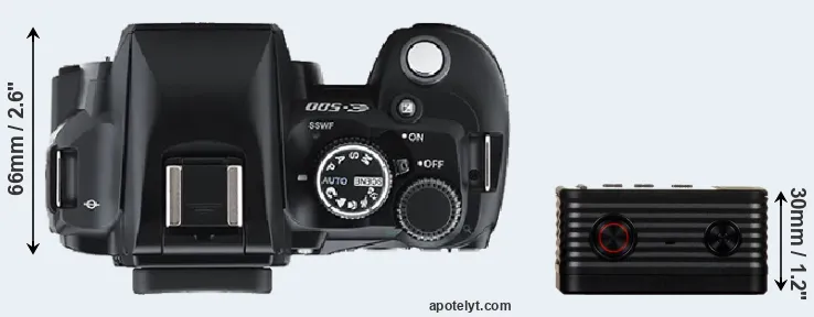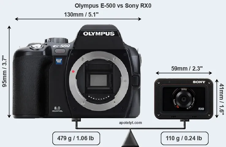 An illustration of the physical size and weight of the Olympus E-500 and the Sony RX0 is provided in the side-by-side display below. The two cameras are presented according to their relative size. Three consecutive views from the front, the top, and the rear side are shown. All width, height and depth measures are rounded to the nearest millimeter.