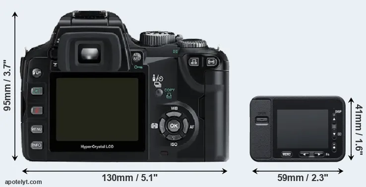 | 5. | Olympus E-330 | Four Thirds | 7.4 | 3136 | 2352 | none | 20.8 | 10.4 | 73 | 52 | |