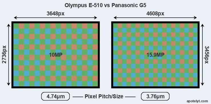 While the two cameras under review share the same sensor size, the G5 offers a higher resolution of 15.9 megapixels, compared with 10 MP of the E-510. This megapixels advantage translates into a 26 percent gain in linear resolution. On the other hand, these sensor specs imply that the G5 has a higher pixel density and a smaller size of the individual pixel (with a pixel pitch of 3.76μm versus 4.74μm for the E-510). However, it should be noted that the G5 is much more recent (by 5 years and 4 months) than the E-510, and its sensor will have benefitted from technological advances during this time that compensate for the smaller pixel size.