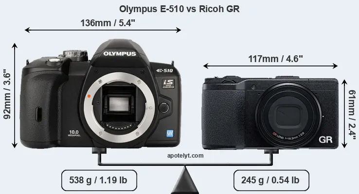 If the front view area (width x height) of the cameras is taken as an aggregate measure of their size, the Ricoh GR is considerably smaller (43 percent) than the Olympus E-510. In this context, it is worth noting that neither the E-510 nor the GR are weather-sealed.