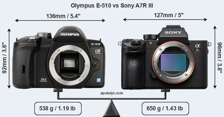 An illustration of the physical size and weight of the Olympus E-510 and the Sony A7R III is provided in the side-by-side display below. The two cameras are presented according to their relative size. Three successive views from the front, the top, and the rear are shown. All width, height and depth measures are rounded to the nearest millimeter.