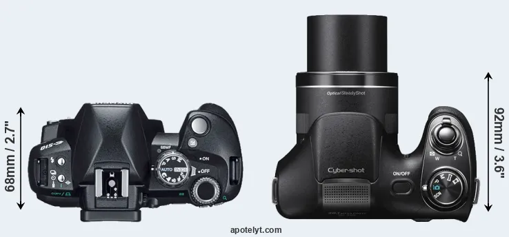 If the front view area (width x height) of the cameras is taken as an aggregate measure of their size, the Sony H300 is notably smaller (9 percent) than the Olympus E-510. In this context, it is worth noting that neither the E-510 nor the H300 are weather-sealed.