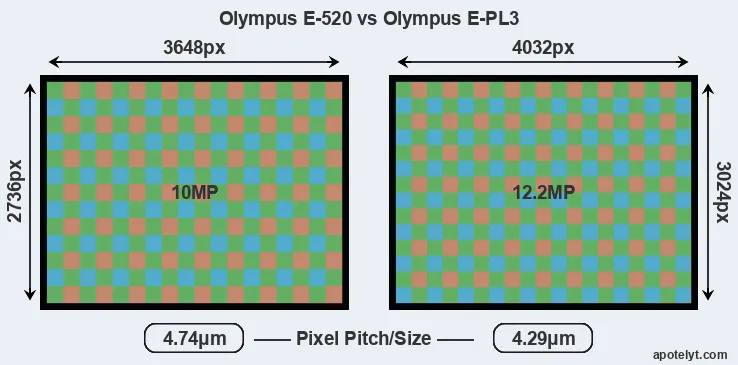 While the two cameras under review share the same sensor size, the E-PL3 offers a higher resolution of 12.2 megapixels, compared with 10 MP of the E-520. This megapixels advantage translates into a 11 percent gain in linear resolution. On the other hand, these sensor specs imply that the E-PL3 has a higher pixel density and a smaller size of the individual pixel (with a pixel pitch of 4.29μm versus 4.74μm for the E-520). However, it should be noted that the E-PL3 is much more recent (by 3 years and 1 month) than the E-520, and its sensor will have benefitted from technological advances during this time that compensate for the smaller pixel size.