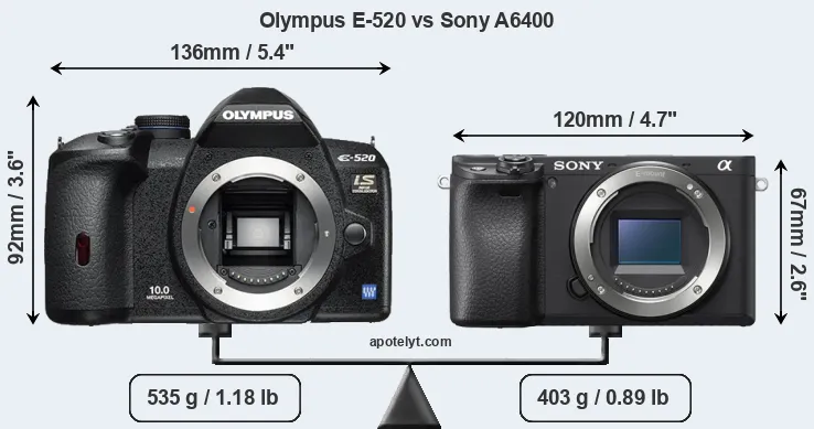 If the front view area (width x height) of the cameras is taken as an aggregate measure of their size, the Sony A6400 is considerably smaller (36 percent) than the Olympus E-520. Moreover, the A6400 is markedly lighter (25 percent) than the E-520. It is noteworthy in this context that the A6400 is splash and dust-proof, while the E-520 does not feature any corresponding weather-sealing.