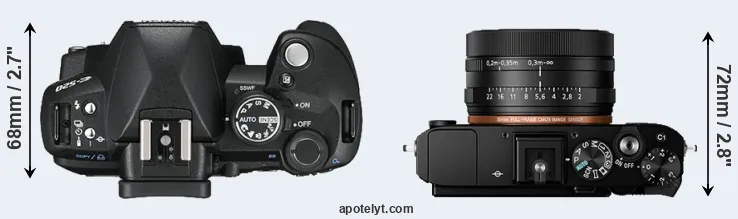 The side-by-side display below illustrates the physical size and weight of the Olympus E-520 and the Sony RX1R II. The two cameras are presented according to their relative size. Three successive views from the front, the top, and the rear are shown. All size dimensions are rounded to the nearest millimeter.