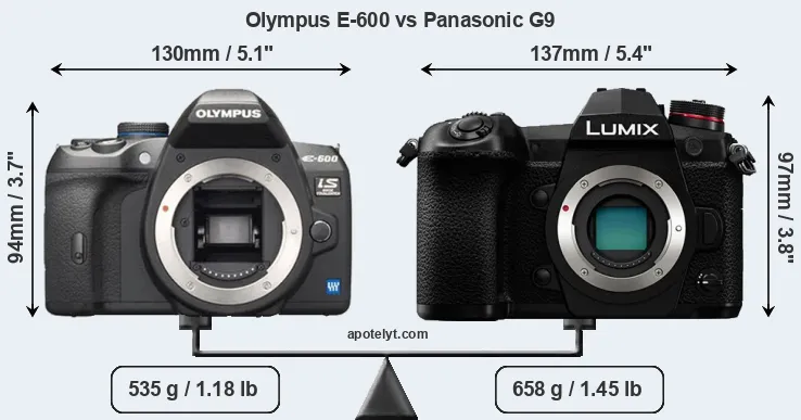 If the front view area (width x height) of the cameras is taken as an aggregate measure of their size, the Panasonic G9 is notably larger (9 percent) than the Olympus E-600. Moreover, the G9 is markedly heavier (23 percent) than the E-600. It is noteworthy in this context that the G9 is splash and dust-proof, while the E-600 does not feature any corresponding weather-sealing.