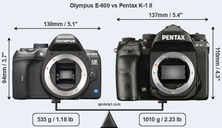 If the front view area (width x height) of the cameras is taken as an aggregate measure of their size, the Pentax K-1 II is notably larger (23 percent) than the Olympus E-600. Moreover, the K-1 II is substantially heavier (89 percent) than the E-600. It is noteworthy in this context that the K-1 II is splash and dust-proof, while the E-600 does not feature any corresponding weather-sealing.