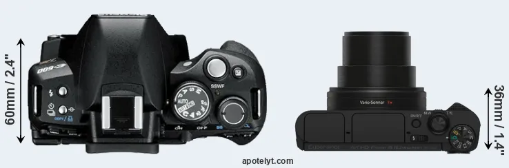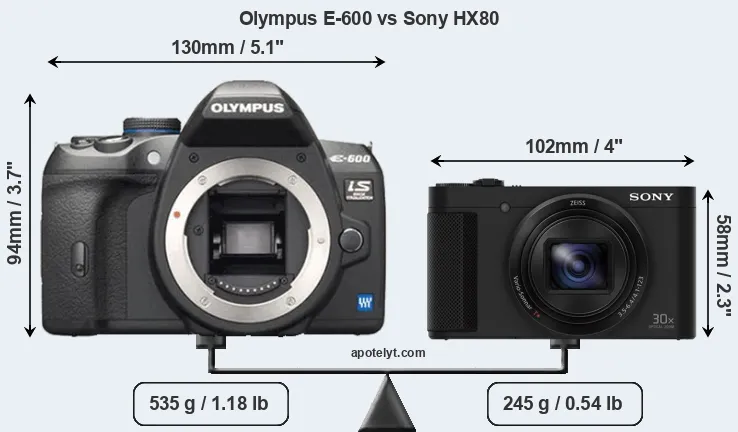 The side-by-side display below illustrates the physical size and weight of the Olympus E-600 and the Sony HX80. The two cameras are presented according to their relative size. Three consecutive views from the front, the top, and the rear side are shown. All width, height and depth dimensions are rounded to the nearest millimeter.