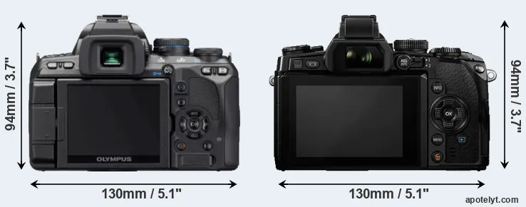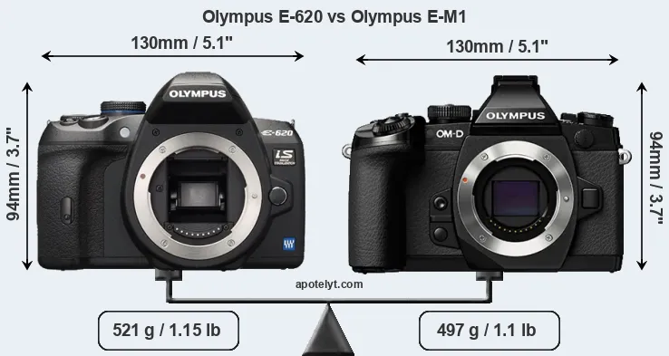 In this particular case, the Olympus E-620 and the Olympus E-M1 have exactly the same width and height, and, thus, have identically-sized bodies. However, the E-M1 is markedly lighter (5 percent) than the E-620. It is noteworthy in this context that the E-M1 is splash and dust-proof, while the E-620 does not feature any corresponding weather-sealing.