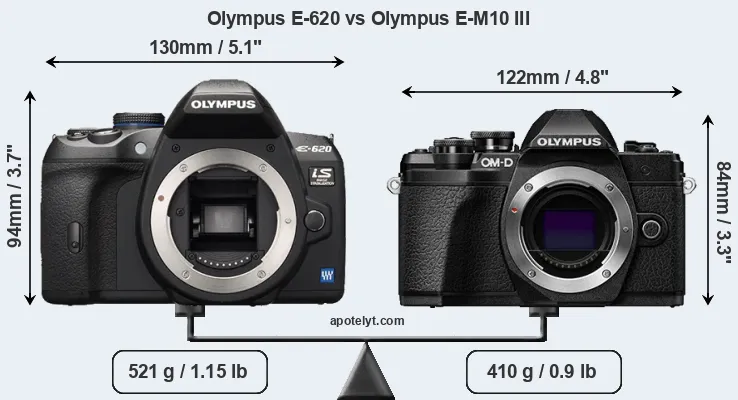 An illustration of the physical size and weight of the Olympus E-620 and the Olympus E-M10 III is provided in the side-by-side display below. The two cameras are presented according to their relative size. Three successive views from the front, the top, and the rear are shown. All width, height and depth dimensions are rounded to the nearest millimeter.