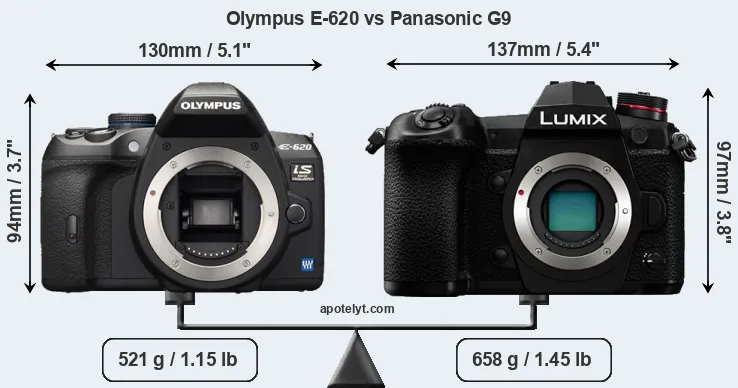 If the front view area (width x height) of the cameras is taken as an aggregate measure of their size, the Panasonic G9 is notably larger (9 percent) than the Olympus E-620. Moreover, the G9 is markedly heavier (26 percent) than the E-620. It is noteworthy in this context that the G9 is splash and dust-proof, while the E-620 does not feature any corresponding weather-sealing.