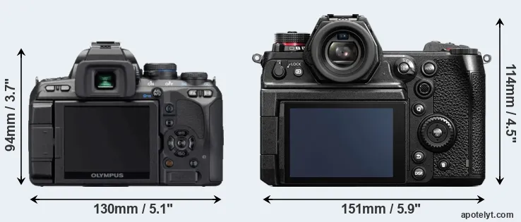 If the front view area (width x height) of the cameras is taken as an aggregate measure of their size, the Panasonic S1H is notably larger (41 percent) than the Olympus E-620. Moreover, the S1H is substantially heavier (102 percent) than the E-620. It is noteworthy in this context that the S1H is splash and dust-proof, while the E-620 does not feature any corresponding weather-sealing.