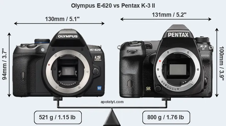 If the front view area (width x height) of the cameras is taken as an aggregate measure of their size, the Pentax K-3 II is notably larger (7 percent) than the Olympus E-620. Moreover, the K-3 II is substantially heavier (54 percent) than the E-620. It is noteworthy in this context that the K-3 II is splash and dust-proof, while the E-620 does not feature any corresponding weather-sealing.