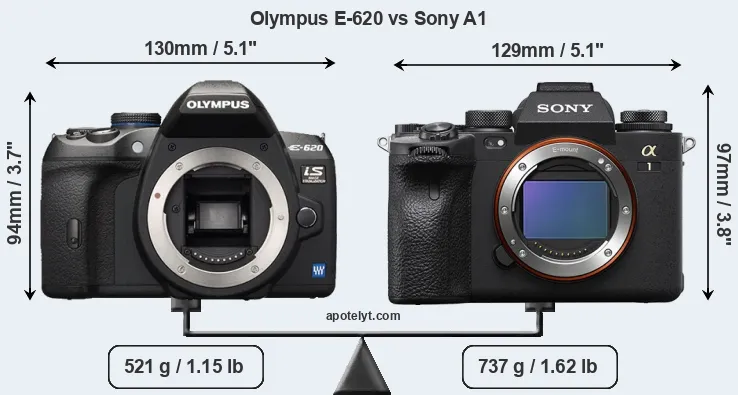If the front view area (width x height) of the cameras is taken as an aggregate measure of their size, the Sony A1 is somewhat larger (2 percent) than the Olympus E-620. Moreover, the A1 is substantially heavier (41 percent) than the E-620. It is noteworthy in this context that the A1 is splash and dust-proof, while the E-620 does not feature any corresponding weather-sealing.