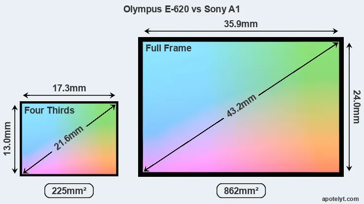 Of the two cameras under consideration, the Olympus E-620 features a Four Thirds sensor and the Sony A1 a full frame sensor. The sensor area in the A1 is 283 percent bigger. As a result of these sensor size differences, the cameras have a format factor of, respectively, 2.0 and 1.0. The sensor in the E-620 has a native 4:3 aspect ratio, while the one in the A1 offers a 3:2 aspect.