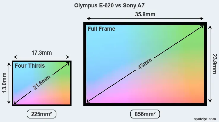 Of the two cameras under consideration, the Olympus E-620 features a Four Thirds sensor and the Sony A7 a full frame sensor. The sensor area in the A7 is 280 percent bigger. As a result of these sensor size differences, the cameras have a format factor of, respectively, 2.0 and 1.0. The sensor in the E-620 has a native 4:3 aspect ratio, while the one in the A7 offers a 3:2 aspect.