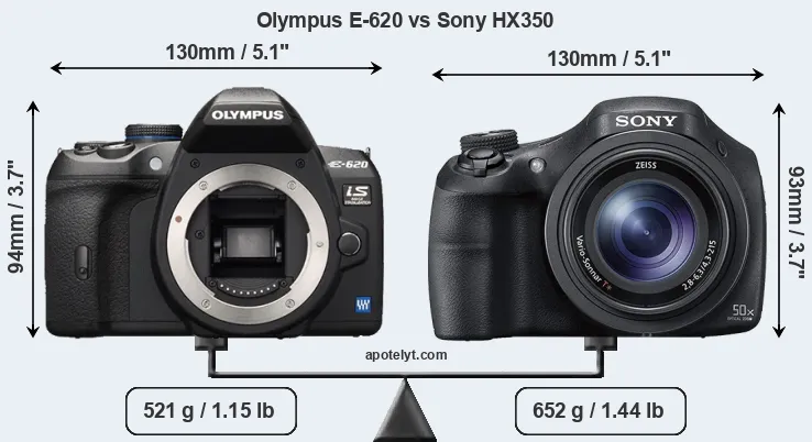 The side-by-side display below illustrates the physical size and weight of the Olympus E-620 and the Sony HX350. The two cameras are presented according to their relative size. Three successive views from the front, the top, and the rear are shown. All size dimensions are rounded to the nearest millimeter.