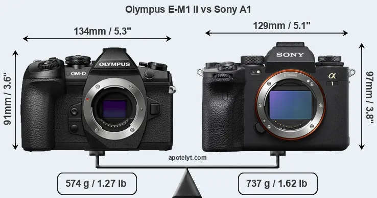 If the front view area (width x height) of the cameras is taken as an aggregate measure of their size, the Sony A1 is somewhat larger (3 percent) than the Olympus E-M1 II. Moreover, the A1 is markedly heavier (28 percent) than the E-M1 II. In this context, it is worth noting that both cameras are splash and dust-proof and can, hence, be used in inclement weather conditions or harsh environments.