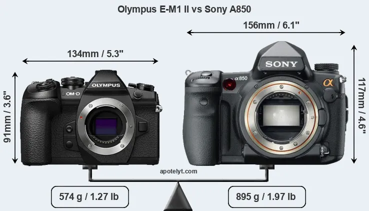 The physical size and weight of the Olympus E-M1 II and the Sony A850 are illustrated in the side-by-side display below. The two cameras are presented according to their relative size. Three successive views from the front, the top, and the rear are shown. All width, height and depth measures are rounded to the nearest millimeter.