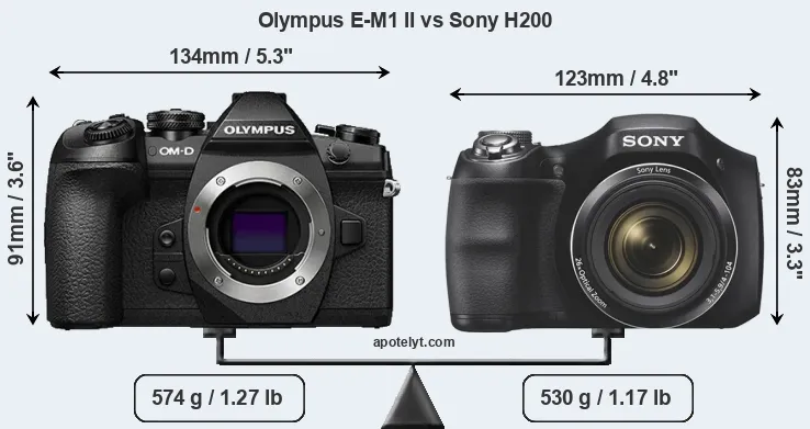 The physical size and weight of the Olympus E-M1 II and the Sony H200 are illustrated in the side-by-side display below. The two cameras are presented according to their relative size. Three consecutive perspectives from the front, the top, and the back are available. All width, height and depth measures are rounded to the nearest millimeter.