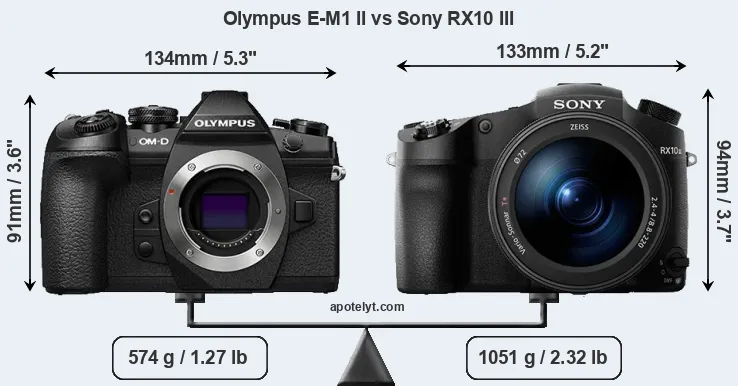 The above size and weight comparisons are to some extent incomplete and possibly misleading, as the RX10 III has a lens built in, whereas the E-M1 II is an interchangeable lens camera that requires a separate lens. Attaching the latter will add extra weight and bulk to the setup. You can compare the optics available for the E-M1 II and their specifications in the Micro Four Thirds Lens Catalog.