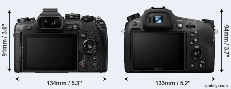 If the front view area (width x height) of the cameras is taken as an aggregate measure of their size, the Sony RX10 III is somewhat larger (3 percent) than the Olympus E-M1 II. In this context, it is worth noting that both cameras are splash and dust-proof and can, hence, be used in inclement weather conditions or harsh environments.