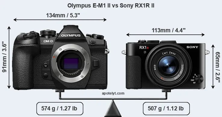 The side-by-side display below illustrates the physical size and weight of the Olympus E-M1 II and the Sony RX1R II. The two cameras are presented according to their relative size. Three consecutive perspectives from the front, the top, and the back are available. All size dimensions are rounded to the nearest millimeter.