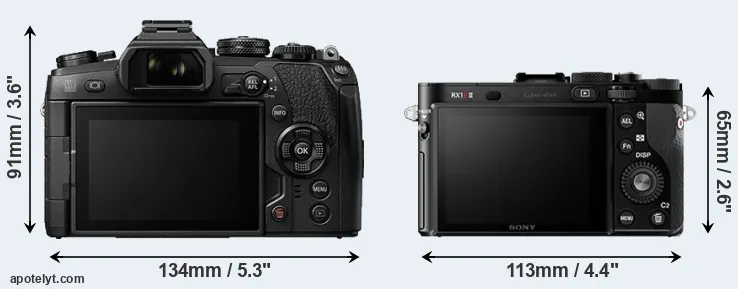 If the front view area (width x height) of the cameras is taken as an aggregate measure of their size, the Sony RX1R II is considerably smaller (40 percent) than the Olympus E-M1 II. It is worth mentioning in this context that the E-M1 II is splash and dust resistant, while the RX1R II does not feature any corresponding weather-sealing.