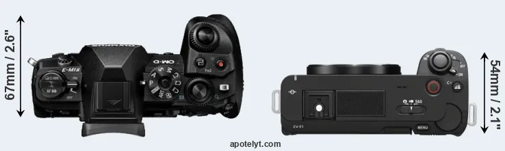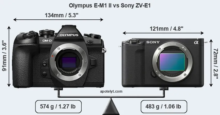 The side-by-side display below illustrates the physical size and weight of the Olympus E-M1 II and the Sony ZV-E1. The two cameras are presented according to their relative size. Three consecutive perspectives from the front, the top, and the back are available. All width, height and depth dimensions are rounded to the nearest millimeter.