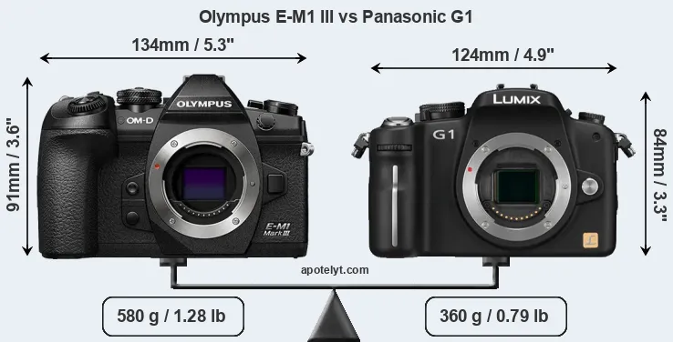 If the front view area (width x height) of the cameras is taken as an aggregate measure of their size, the Panasonic G1 is notably smaller (15 percent) than the Olympus E-M1 III. Moreover, the G1 is substantially lighter (38 percent) than the E-M1 III. It is worth mentioning in this context that the E-M1 III is splash and dust resistant, while the G1 does not feature any corresponding weather-sealing.