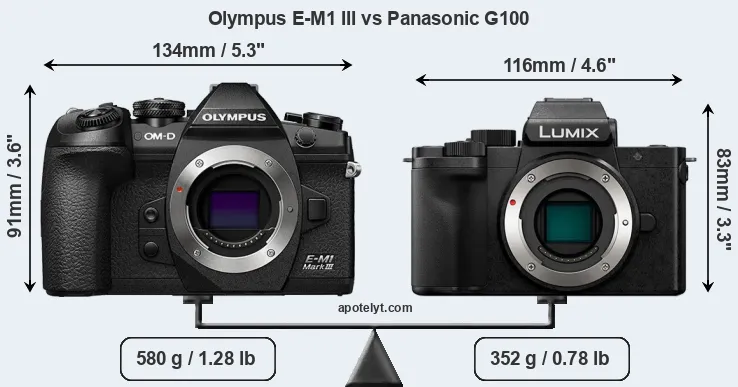 If the front view area (width x height) of the cameras is taken as an aggregate measure of their size, the Panasonic G100 is notably smaller (21 percent) than the Olympus E-M1 III. Moreover, the G100 is substantially lighter (39 percent) than the E-M1 III. It is worth mentioning in this context that the E-M1 III is splash and dust resistant, while the G100 does not feature any corresponding weather-sealing.