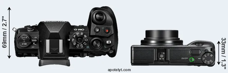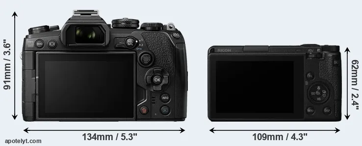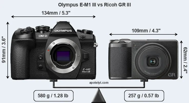An illustration of the physical size and weight of the Olympus E-M1 III and the Ricoh GR III is provided in the side-by-side display below. The two cameras are presented according to their relative size. Three successive views from the front, the top, and the rear are shown. All width, height and depth measures are rounded to the nearest millimeter.