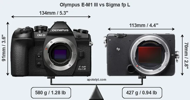 An illustration of the physical size and weight of the Olympus E-M1 III and the Sigma fp L is provided in the side-by-side display below. The two cameras are presented according to their relative size. Three successive views from the front, the top, and the rear are shown. All size dimensions are rounded to the nearest millimeter.