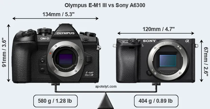 The physical size and weight of the Olympus E-M1 III and the Sony A6300 are illustrated in the side-by-side display below. The two cameras are presented according to their relative size. Three consecutive views from the front, the top, and the rear side are shown. All width, height and depth dimensions are rounded to the nearest millimeter.