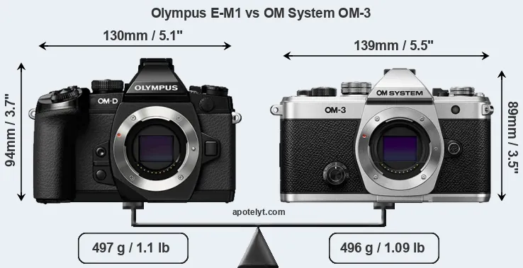 The physical size and weight of the Olympus E-M1 and the OM System OM-3 are illustrated in the side-by-side display below. The two cameras are presented according to their relative size. Three consecutive perspectives from the front, the top, and the back are available. All width, height and depth measures are rounded to the nearest millimeter.