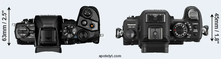 The side-by-side display below illustrates the physical size and weight of the Olympus E-M1 and the Panasonic GH1. The two cameras are presented according to their relative size. Three consecutive views from the front, the top, and the rear side are shown. All width, height and depth dimensions are rounded to the nearest millimeter.