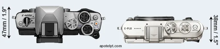 The physical size and weight of the Olympus E-M10 II and the Olympus E-PL8 are illustrated in the side-by-side display below. The two cameras are presented according to their relative size. Three consecutive perspectives from the front, the top, and the back are available. All width, height and depth dimensions are rounded to the nearest millimeter.