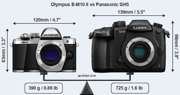 If the front view area (width x height) of the cameras is taken as an aggregate measure of their size, the Panasonic GH5 is notably larger (37 percent) than the Olympus E-M10 II. Moreover, the GH5 is substantially heavier (86 percent) than the E-M10 II. It is noteworthy in this context that the GH5 is splash and dust-proof, while the E-M10 II does not feature any corresponding weather-sealing.