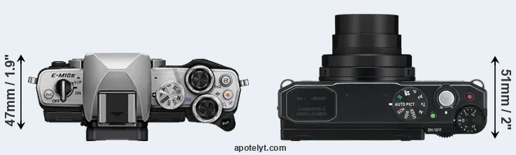 The above size and weight comparisons are to some extent incomplete and possibly misleading, as the MX-1 has a lens built in, whereas the E-M10 II is an interchangeable lens camera that requires a separate lens. Attaching the latter will add extra weight and bulk to the setup. You can compare the optics available for the E-M10 II and their specifications in the Micro Four Thirds Lens Catalog.