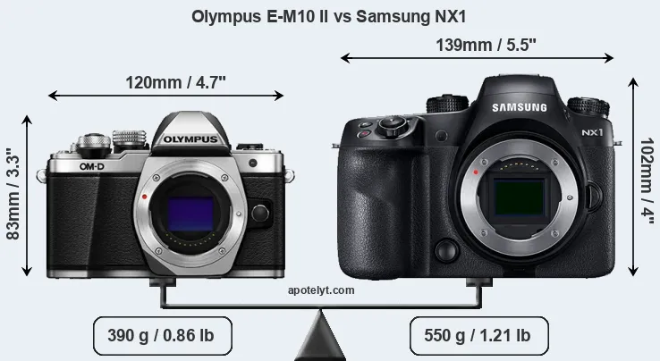 If the front view area (width x height) of the cameras is taken as an aggregate measure of their size, the Samsung NX1 is notably larger (42 percent) than the Olympus E-M10 II. Moreover, the NX1 is substantially heavier (41 percent) than the E-M10 II. It is noteworthy in this context that the NX1 is splash and dust-proof, while the E-M10 II does not feature any corresponding weather-sealing.