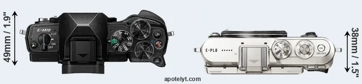 The physical size and weight of the Olympus E-M10 IV and the Olympus E-PL8 are illustrated in the side-by-side display below. The two cameras are presented according to their relative size. Three consecutive perspectives from the front, the top, and the back are available. All width, height and depth dimensions are rounded to the nearest millimeter.