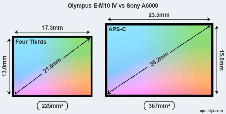 Of the two cameras under consideration, the Olympus E-M10 IV features a Four Thirds sensor and the Sony A6000 an APS-C sensor. The sensor area in the A6000 is 63 percent bigger. As a result of these sensor size differences, the cameras have a format factor of, respectively, 2.0 and 1.5. The sensor in the E-M10 IV has a native 4:3 aspect ratio, while the one in the A6000 offers a 3:2 aspect.
