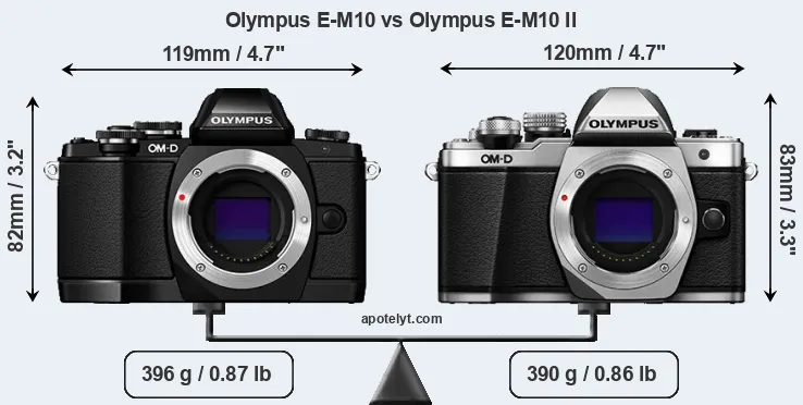If the front view area (width x height) of the cameras is taken as an aggregate measure of their size, the Olympus E-M10 II is somewhat larger (2 percent) than the Olympus E-M10. However, the E-M10 II is slightly lighter (2 percent) than the E-M10. In this context, it is worth noting that neither the E-M10 nor the E-M10 II are weather-sealed.