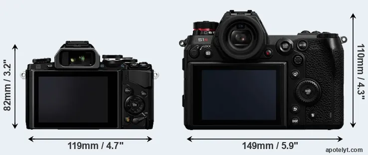 The physical size and weight of the Olympus E-M10 and the Panasonic S1R are illustrated in the side-by-side display below. The two cameras are presented according to their relative size. Three successive views from the front, the top, and the rear are shown. All width, height and depth dimensions are rounded to the nearest millimeter.