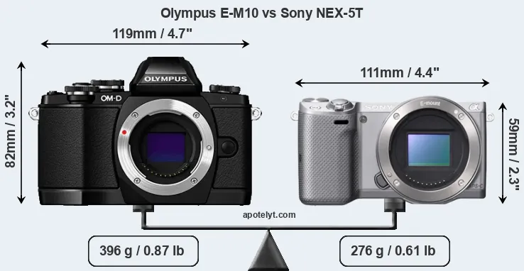 If the front view area (width x height) of the cameras is taken as an aggregate measure of their size, the Sony NEX-5T is considerably smaller (33 percent) than the Olympus E-M10. Moreover, the NEX-5T is markedly lighter (30 percent) than the E-M10. In this context, it is worth noting that neither the E-M10 nor the NEX-5T are weather-sealed.