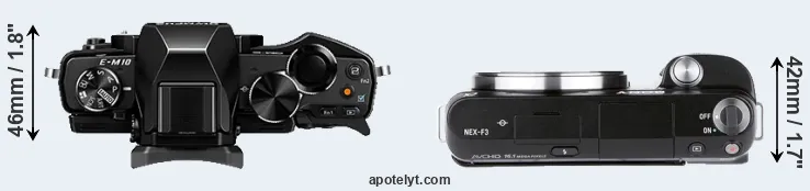 The physical size and weight of the Olympus E-M10 and the Sony NEX-F3 are illustrated in the side-by-side display below. The two cameras are presented according to their relative size. Three successive views from the front, the top, and the rear are shown. All width, height and depth measures are rounded to the nearest millimeter.