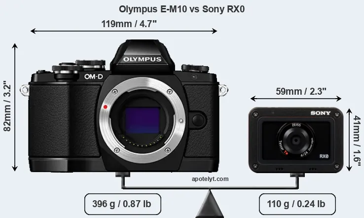 If the front view area (width x height) of the cameras is taken as an aggregate measure of their size, the Sony RX0 is considerably smaller (75 percent) than the Olympus E-M10. It is noteworthy in this context that the RX0 is splash and dust-proof, while the E-M10 does not feature any corresponding weather-sealing. More than that, the RX0 is water-proof up to 10m and can, thus, be used for underwater photography.