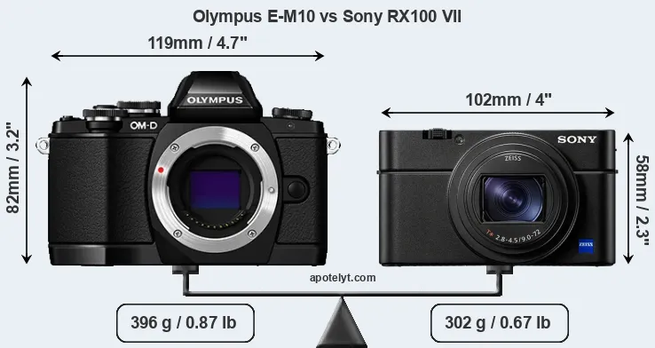 An illustration of the physical size and weight of the Olympus E-M10 and the Sony RX100 VII is provided in the side-by-side display below. The two cameras are presented according to their relative size. Three consecutive perspectives from the front, the top, and the back are available. All size dimensions are rounded to the nearest millimeter.