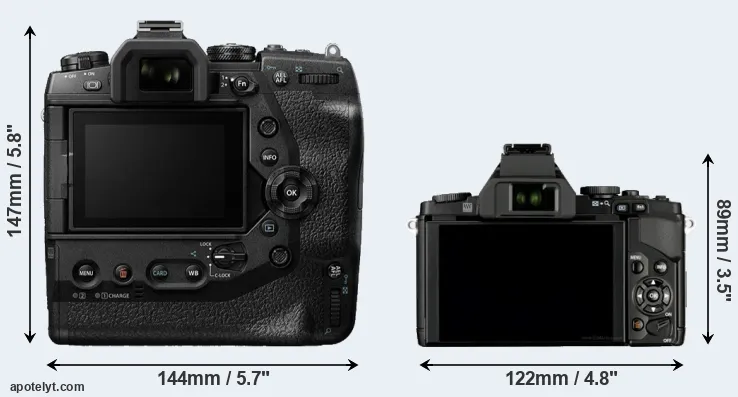 If the front view area (width x height) of the cameras is taken as an aggregate measure of their size, the Olympus E-M5 is considerably smaller (49 percent) than the Olympus E-M1X. Moreover, the E-M5 is substantially lighter (57 percent) than the E-M1X. In this context, it is worth noting that both cameras are splash and dust-proof and can, hence, be used in inclement weather conditions or harsh environments.
